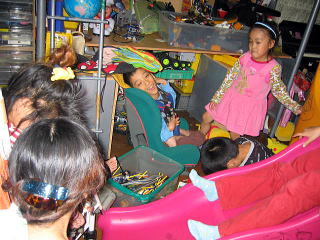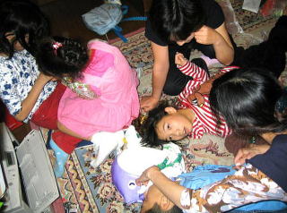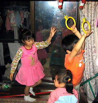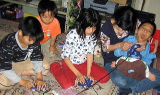 さー次はゲームするでー はりきるぽこママ! ぽこ「かーちゃん、、く、くるしー くびが、、くびがくるしー」 と言ってるようだ。。(笑) |