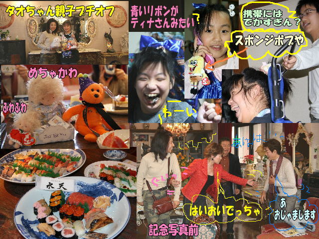 関東から、タオちゃん親子が会いにきてくれた タオちゃんとは、ビーニーのぬいぐるみつながりに、なるよね 親子で仲良く旅行ってほほえましいなあ。仲良しっていいなあ 実家で お昼をたべてすごした。 (水天さんのお寿司です) 貴重な観光途中に 会いにきてくれて ありがとう〜 おみやげに、最近のTyのお人形や 美琴に手作りリボンやスカート、くつしたetc いっぱい いただきました ありがとう♪