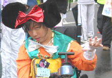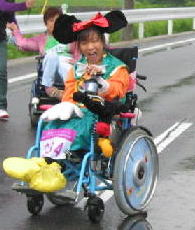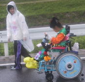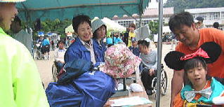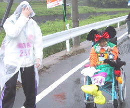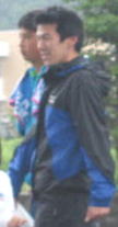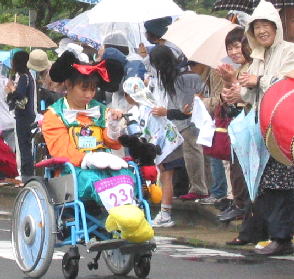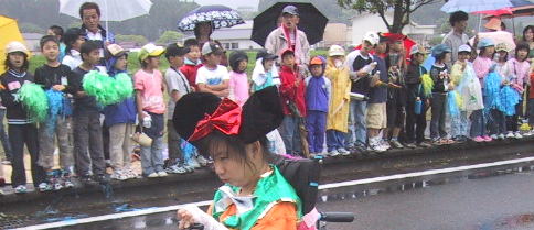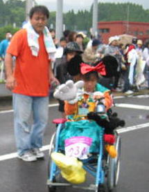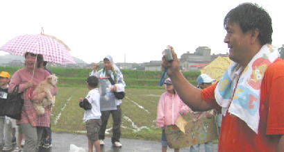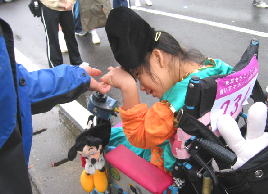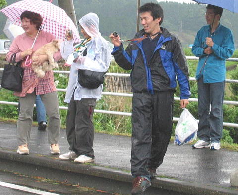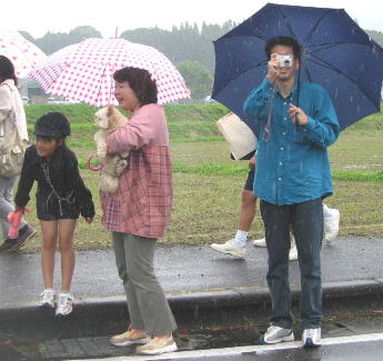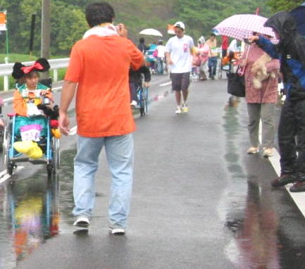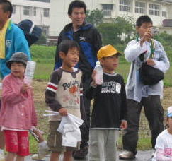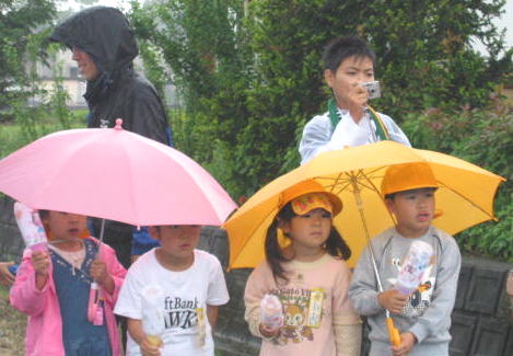 子供は雨の中、ペットボトルで応援ありがとう、 後ろの青兄ちゃんは よっしーさん