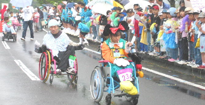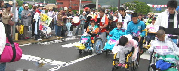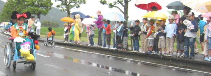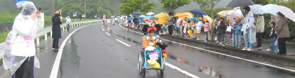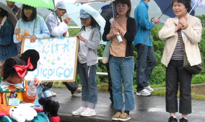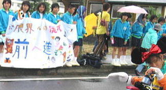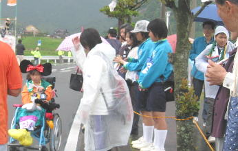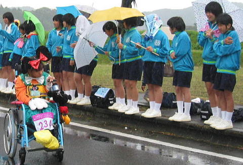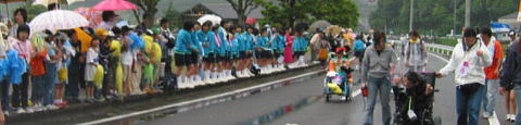 雨の中、沿道いっぱいの応援する人たち
