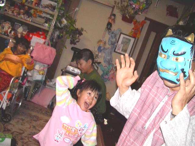 おめんをかぶればお父さんは、鬼に変身するとも思っている。