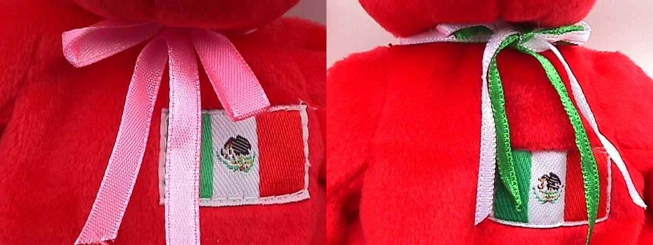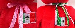 旗とリボンのアップ 右が本物 偽物は少し大きい ふち縫いも荒め |