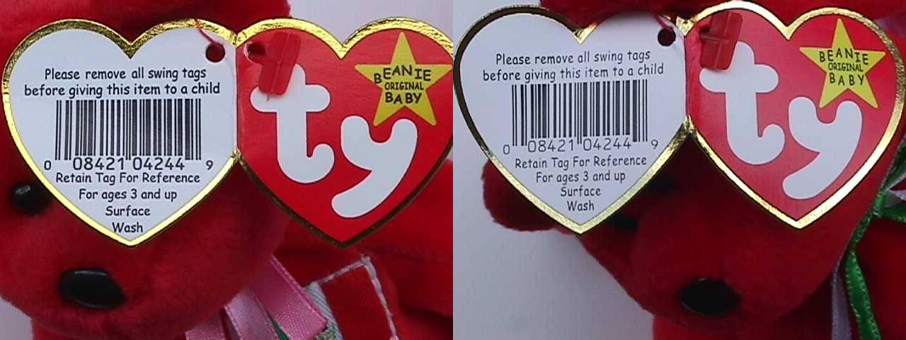 右が本物。 偽物の色は明るい。 リボンも違います。 |