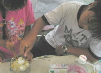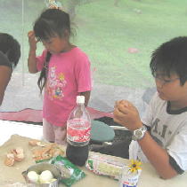 小雨、、タープの中で、たまごサラダ作り、ウインナー