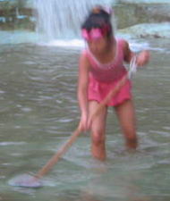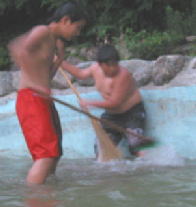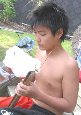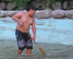 竹棒とふくろと枝とかでアミ作りっち、、魚つかまえるんち、、