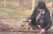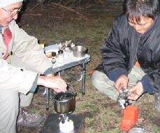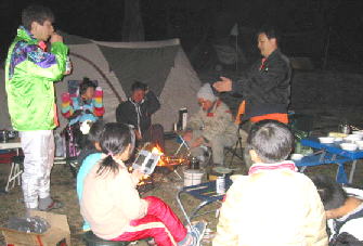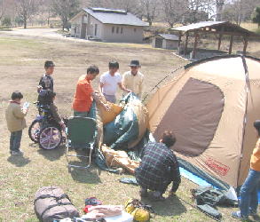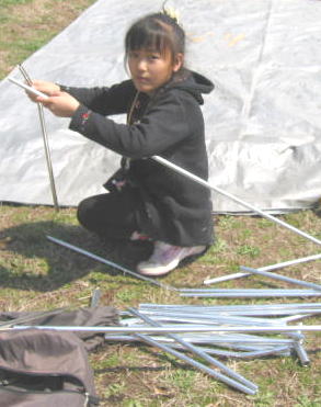 初キャンプでテント設営のkさん。みんなと一緒に♪