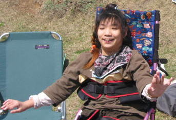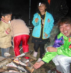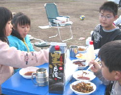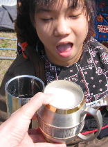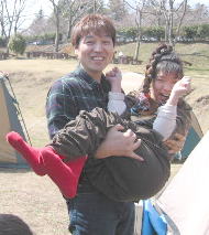 めが丼慣れた様子でポールの組立て。美琴と私、、この陽気にビールとコーラいただきー♪