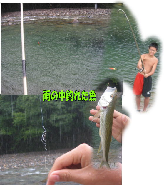 皇帝びしょぬれで朝から釣り。えさ??なんと「ごはんつぶ」です。。笑