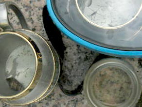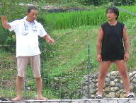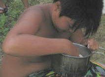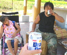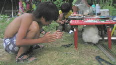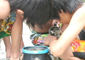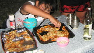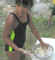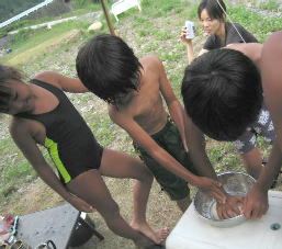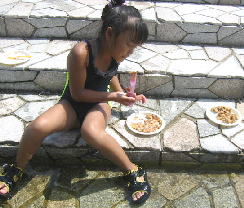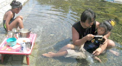 あつくて炊事場で食べるパパと美琴。子供は川で。