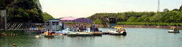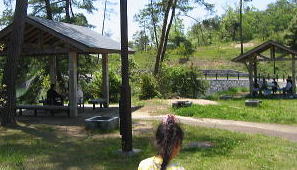 湖のよこに東屋がありお弁当食べてる家族あり。