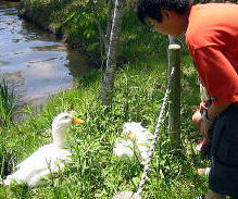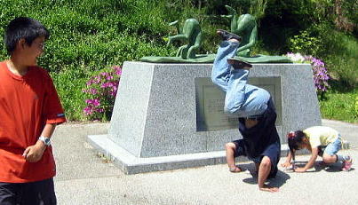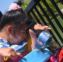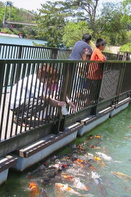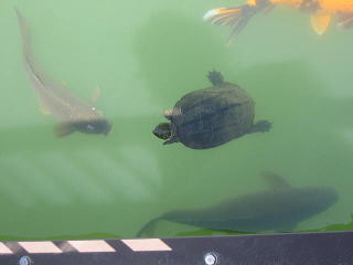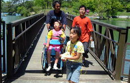 湖には鯉やカメが。美琴は車椅子から下を見ます。あんまりみえんかな?
