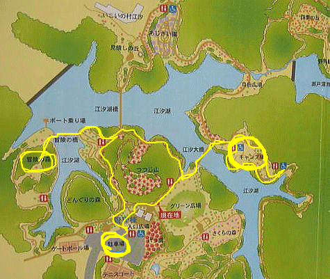 公園内ひろいっちゃ。我が家が歩いた場所を黄色で示してみました。