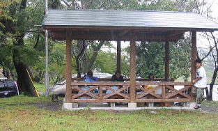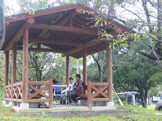 ![]() 立派な東屋で、タープもいらない。椅子もいらない。広さも十分!!今日は ここで過ごしマショー〜〜♪ |