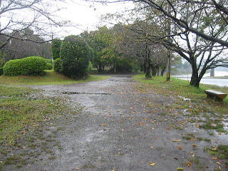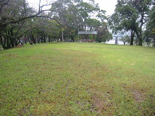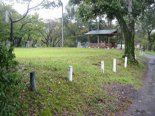 | 公園は ぐるっとOのように車で一周できます。真中が東屋付の芝のきれいなここテントサイト 芝が汚れないようにかな?車は入れませんが、東屋の横に数台車がとめられるので すぐ近くにテントを張れば全然 苦になりません |