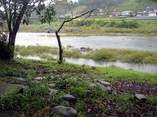 ![]() ![]() 一番奥の所からみた真中の芝サイト 中に入れないように棒あり 横は夜明けダムからの川、、三隈川? |