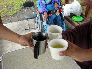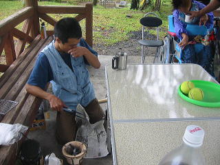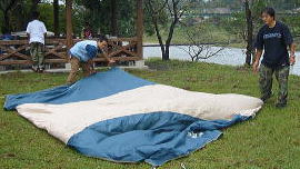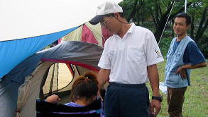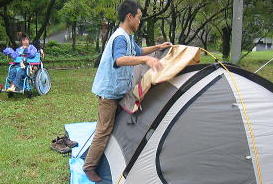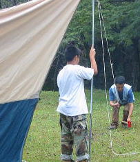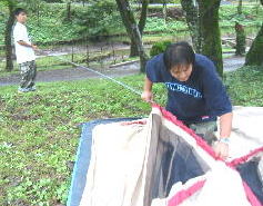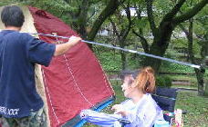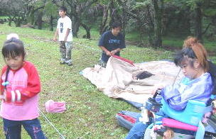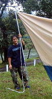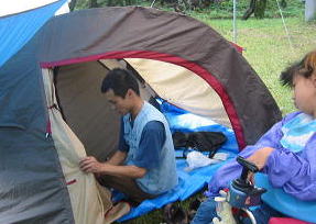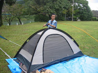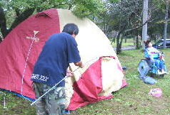 ![]() 雨が上がりました。今のうちにテント設営だ〜がんばれ〜我が家のテントはタープと合わせて1万円でしたわ |