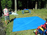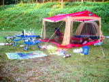 ![]() 初めての朝、、露が一杯。タープの中に荷物を入れて正解 |