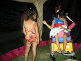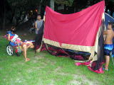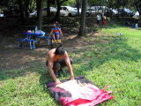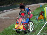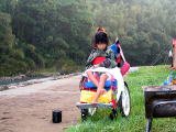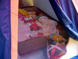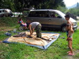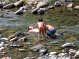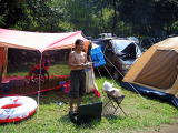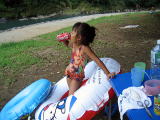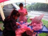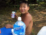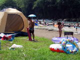 テント建てたら着替えも楽勝〜♪おっかさんも入るぞー。 つ、つめてー。 |