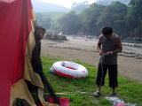 翌朝〜川沿いの朝は寒い。長袖が必要 飯盒の当番、みこ 起きたら早速川遊びの皇帝。見える場所にあるので安心![]() |