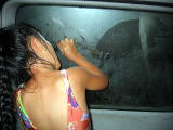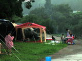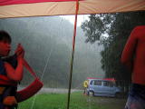 なんとヒョウ!!氷が降ってる!!テントは大丈夫か?車もクーラーの効きが悪いぞ やむのか?この雨 |
