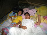 ![]() かたづけ終わり最後の汗を流すとーちゃんに群がる猿兄妹 |