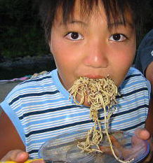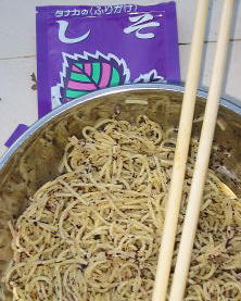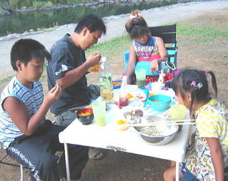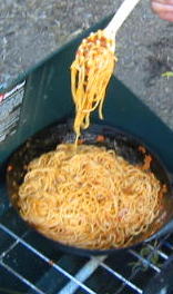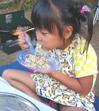 ![]() ![]() ![]() ![]() ![]() 18:40 夜は簡単スパゲティと果物缶詰 味はミートと しそふりかけ味 外で食べたら何でもおいしい |