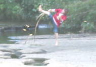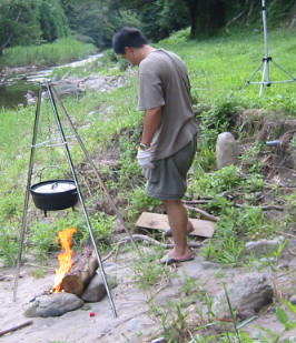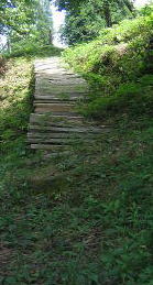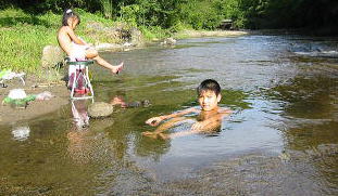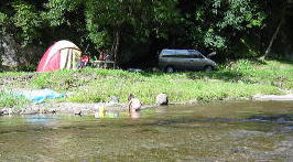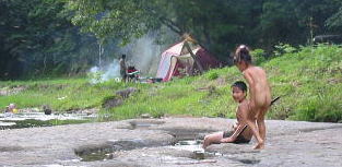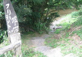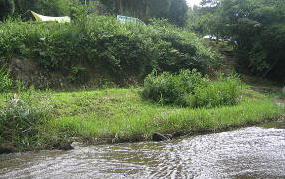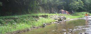 フリーサイトから上にあがるとオートサイト。今にも壊れそうな不安定 木のスロープ。上がってすぐ前もフリーサイト降り口がある こっちは階段 サイト この川沿いがフリーテントサイト(テントは我が家) |