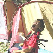 お父さんがこっそり買ったおニューのテント(ノーブランド)入り口にポータブルトイレ見えるかな?前のテントは前に空間がなかったけど今回のテントは前にトイレや車椅子を置ける空間があるので重宝しそうです |