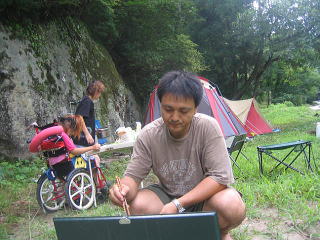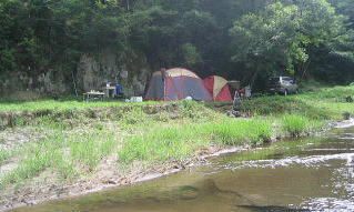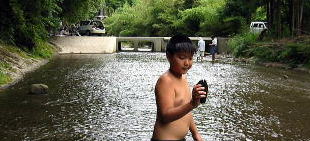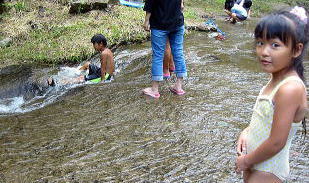 10時 みーんなでキャンプ場廻りの川探検だ〜足だけ水に浸かって気持ちいいよー♪![]() |