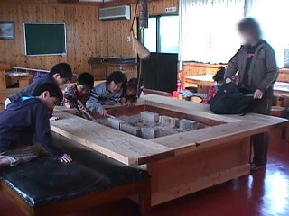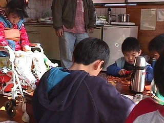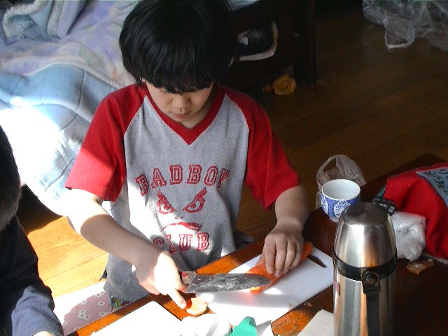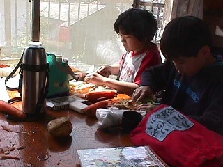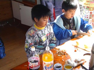 | 夕方のカレーの具を皆で 切ってもらう。皮をむく係り それを切る係り。。 包丁も経験のある子が少なく 怖かったぞー。 |