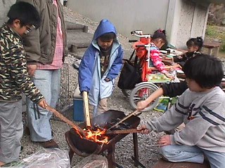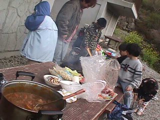 | カレーもできたよ。(手前なべ) 火を木につけて 「ファイヤーソード」といいながら 遊ぶ子供。 |