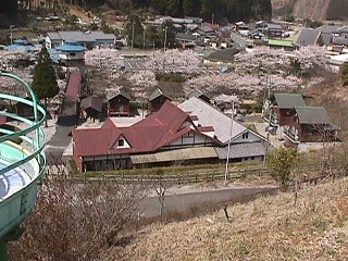 | 途中の山から見たキャンプ場。 桜もきれい。 赤い屋根は昆虫館。 その右の ←ここ『カミキリムシ』の部屋 が泊まったところ。 |