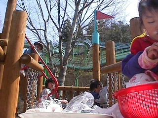 | ぜーんぶつながってなくて 途中一箇所切れている。 頂上まで登れない人は 途中からすべったりする。 すべりだいも適当な長さがいいなぁ。 と実感した。。(笑) |