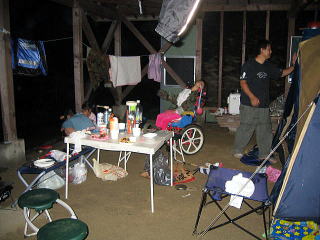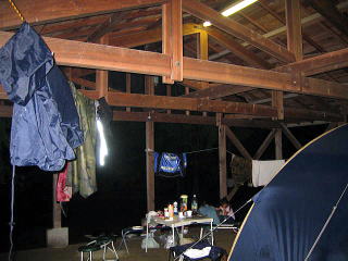 | さっきの昼間オフ会へ 避難移動。。。誰もキャンプしてないおかげで、VIPルーム一段高い相撲部屋のような屋根付きの場所で一泊することができます 電気もあり快適です(でも前は川、後ろは用水路みたいなものがあり増水しないか怖かったりもする) |