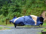 明るくなれば朝、バンガローサイトの散歩。ここらはリッチだ、おじーチャンおバーちゃん達と来てる家族が多かったぞ。朝からビール缶テーブルにおいてご飯の準備。。おおおお |