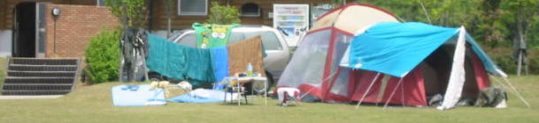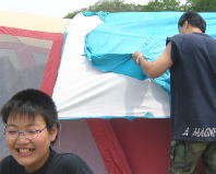 昨日の大風で緑のタープがぼろぼろに。。汗