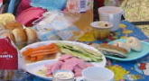 朝は買ったパンとさっき必死に切ったソーセージと生野菜とプリン