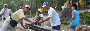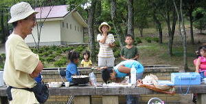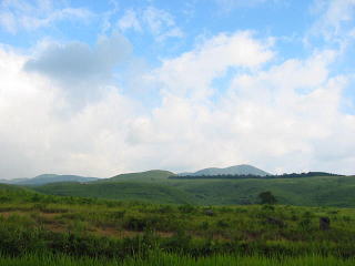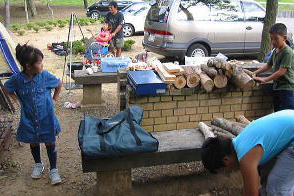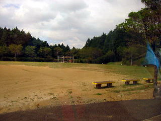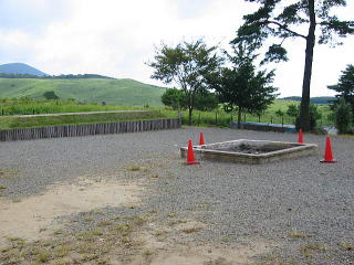 屋根がない炊事場。。雨降るなよ。 駐車場とキャンプファイヤー場後ろにみえるは、気持ちいい高原(演習場みたいだ。別府の十文字みたいな所) |