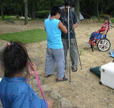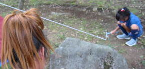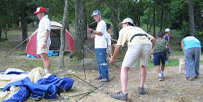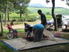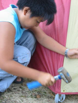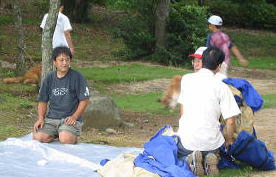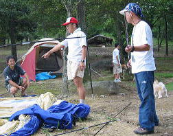 ![]() 男達はnagomiさんのテント設営に取り掛かります。え〜っとこの棒はあっちか??こっちか??? |
