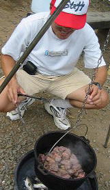 早速おでんの仕込みへ。よっしー君もたまごの殻むきと しいたけの棒の所むしるの手伝っちょくれ♪←勝手に人の子も使う(爆) |