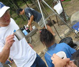 | ジョン君のパパさん1人と犬1匹、visionさんファミリー(4人)、今回初お泊りnagomiさんファミリー4人+犬2匹、shiroさん1人、四代目さん1人 そして近くのキャンプの度に遊びにきてくれるにぎやかなkeiママ親子3人となっちゃんママ親子2人も呑みに食べにきてくれました |