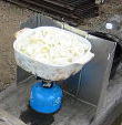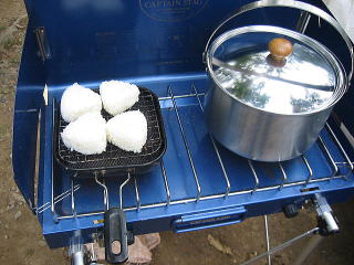 ジョン君のパパさん、小鍋に何??と、カラスさんのおにぎりを焼いてます |