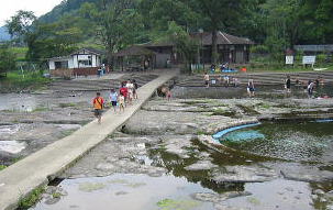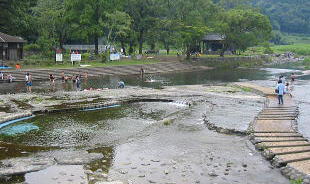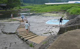 ![]() 橋を渡って、向こうの真中が公民館(宿泊可)と更衣室、トイレ。左白壁が管理棟(かき氷売ってます) 今年は水不足で水が少ない。藻が多いぞすべるぞ。 。 |
