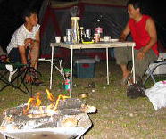 ![]() 17:40テントとタープ完了!!ひとやすみ!!さーのむぞー!!乾杯!!後ろの瓦屋根のある所は踊り場?雨でもしのげる |