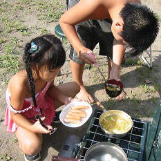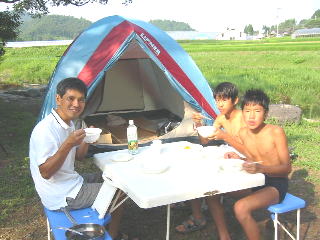 6:30 おはよーおはよー朝ご飯の準備だ キャンプ場の朝は早い 栗田さん親子は早くから起きてたよ。 |