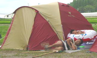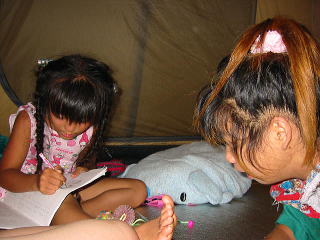 ![]() テントに戻ってしばらくしたら小雨が降りだした テント内でお絵かき中 母は、昼ねしたおかげで酔いがさめた。ここでのみなおしだ。 |