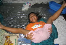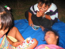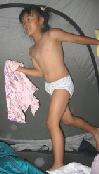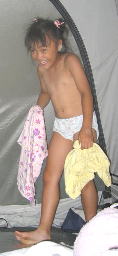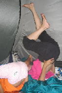 テントのなかでは、早速、ちょっかいだすめが丼