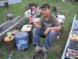 | 男は炭に火をつける | さてイイ具合に煙も出てきたぞー |