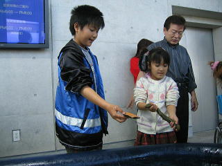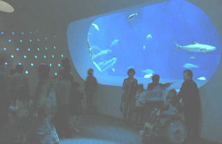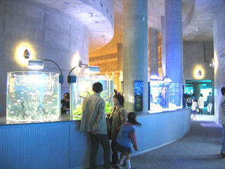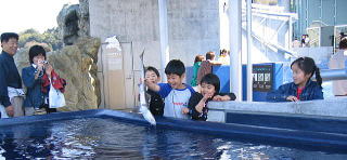 ![]() ![]() 屋内タッチプールには、ひとで、なまこ、魚、貝など。 自由にさわれる |