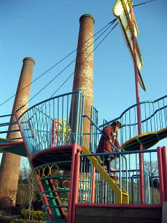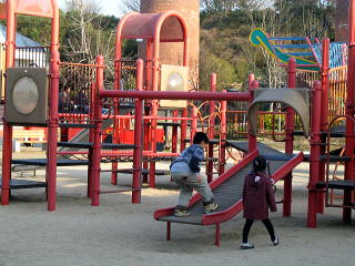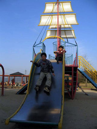 ちょっと急な角度の すべりだい (7歳めが丼は少し怖い) 後ろはポインターを あてた写真のように ジャングルジムっぽい |